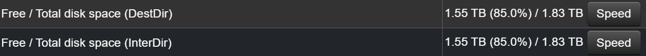 NZBGet includes a built-in disk speed test. In Settings → Status → System, use the Speed buttons next to DestDir and InterDir to test the write speed of the directories used for downloads and temporary files.